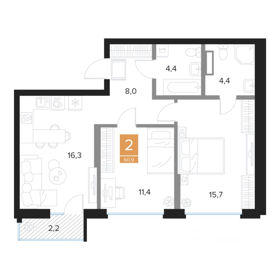 Общая площадь60,9 м2