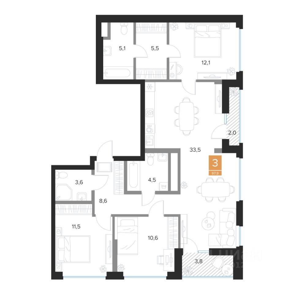 Продаётся 3-комнатная квартира в строящемся доме (2 очередь (2 этап)), срок сдачи: III-кв. 2027, общей площадью 97.9 кв.м., на 10 этаже. Новый жилой комплекс ''Парковый квартал ''Чувства'' от ГК ''Мармакс'' расположен по адресу: г. Курск, ул. Бойцов 9-ой Дивизии