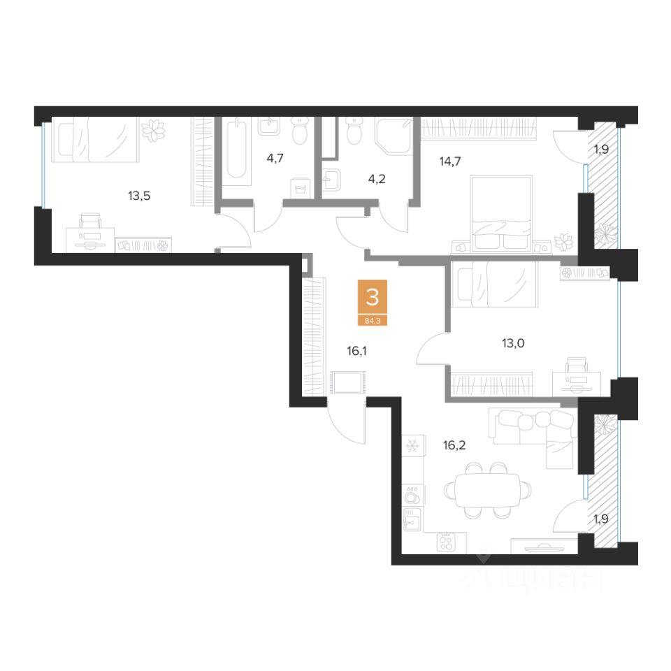 Продаётся 3-комнатная квартира в строящемся доме (2 очередь (2 этап)), срок сдачи: III-кв. 2027, общей площадью 84.3 кв.м., на 3 этаже. Новый жилой комплекс ''Парковый квартал ''Чувства'' от ГК ''Мармакс'' расположен по адресу: г. Курск, ул. Бойцов 9-ой Дивизии